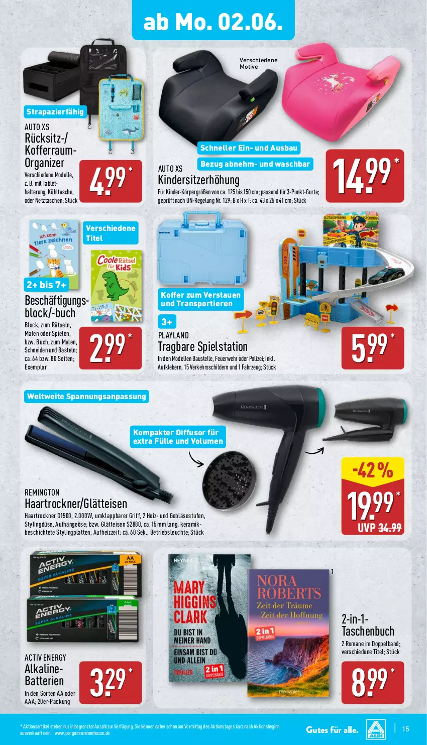 ab Mo. 02.06. Verschiedene Motive Strapazierfähig AUTOXS Rücksitz-/ Kofferraum- Organizer VerschiedeneModelle, z.B.mitTablethalterung,Kühltasche, oderNetztaschen;Stück Schneller Ein- und Ausbau 4.99 AUTOXS * Bezug abnehm- und waschbar Kindersitzerhöhung FürKinder-Körpergrößenvonca.125bis150cm;passendfür3-Punkt-Gurte; geprüftnachUN-RegelungNr.129;BxHxT:ca.43x25x41cm;Stück 14.99 * Verschiedene Titel 2+ bis 7+ Koffer zum Verstauen und Transportieren Beschäftigungs block/-buch Block,zumRätseln, MalenoderSpielen, bzw.Buch,zumMalen, SchneidenundBasteln; ca.64bzw.80Seiten; Exemplar 2.99 3+ PLAYLAND * 5.99 TragbareSpielstation IndenModellenBaustelle,FeuerwehroderPolizei;inkl. Aufklebern,15Verkehrsschildernund1Fahrzeug;Stück * Weltweite Spannungsanpassung Kompakter Diffusor für extra Fülle und Volumen -42 % REMINGTON 19.99 Haartrockner/Glätteisen HaartrocknerD1500,2.000W,umklappbarerGriff,2Heiz-undGebläsestufen, Stylingdüse,Aufhängeöse;bzw.GlätteisenS2880,ca.15mmlang,keramikbeschichteteStylingplatten,Aufheizzeit:ca.60Sek.,Betriebsleuchte;Stück * UVP 34.99 1 2-in-1Taschenbuch 2RomaneimDoppelband; verschiedeneTitel;Stück ACTIV ENERGY AlkalineBatterien In den Sorten AA oder AAA;20er-Packung 3.29 * *AktionsartikelstehennurinbegrenzterAnzahlzurVerfügung.SiekönnendaherschonamVormittagdesAktionstageskurznachAktionsbeginn ausverkauftsein.1www.penguinrandomhouse.de 8.99 Gutes für alle. * 15