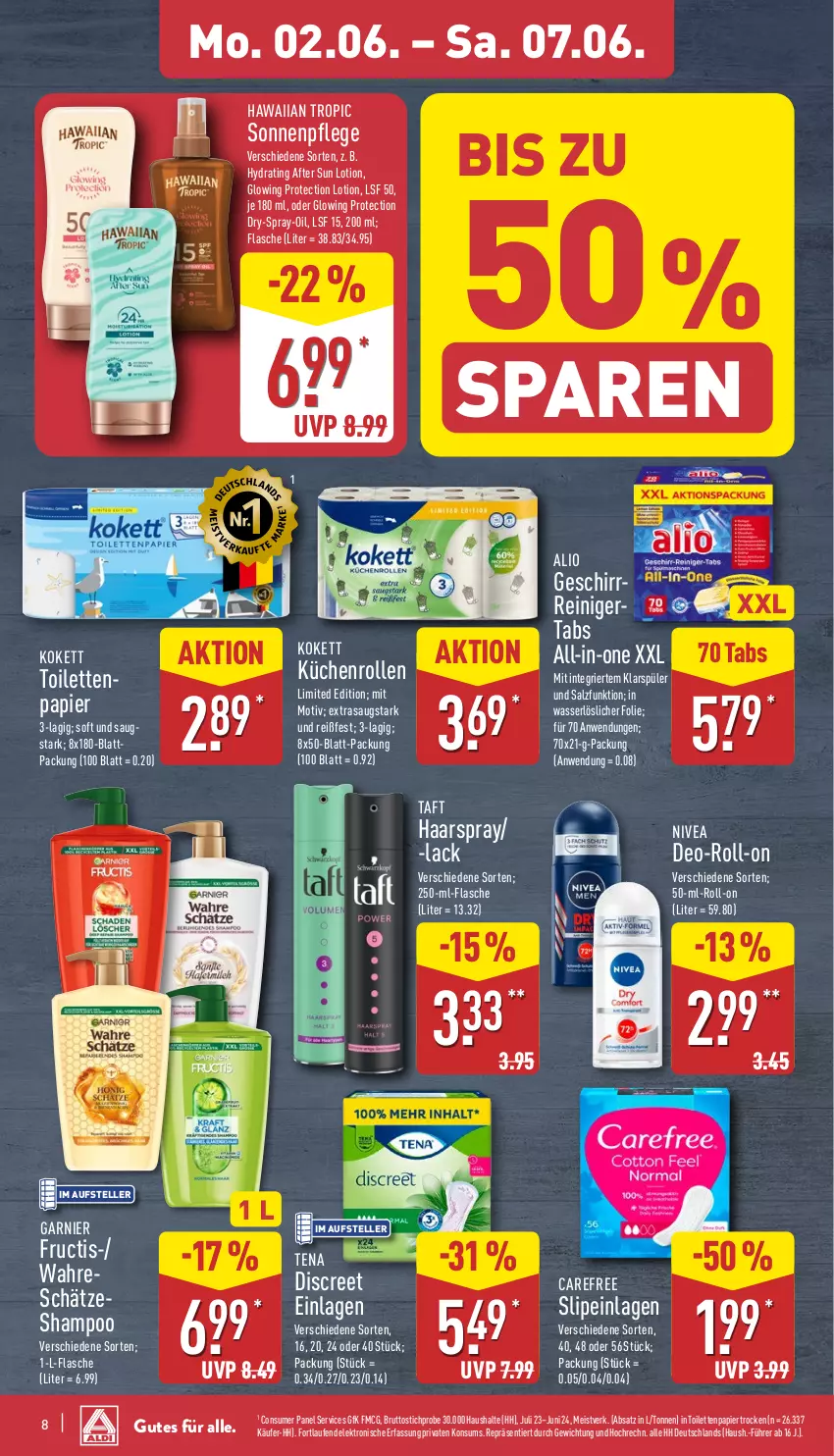 Mo. 02.06. – Sa. 07.06. HAWAIIAN TROPIC Sonnenpflege BIS ZU VerschiedeneSorten,z.B. HydratingAfterSunLotion, GlowingProtectionLotion,LSF50, je180ml,oderGlowingProtection Dry-Spray-Oil,LSF15,200ml; Flasche(Liter=38.83/34.95) 50 % SPAREN -22 % 6.99 * UVP 8.99 1 1 ALIO AKTION KOKETT Toilettenpapier 3-lagig;softundsaugstark;8x180-BlattPackung(100Blatt=0.20) 2.89 * KOKETT Küchenrollen LimitedEdition;mit Motiv;extrasaugstark undreißfest;3-lagig; 8x50-Blatt-Packung (100Blatt=0.92) AKTION 3.69 * GeschirrReinigerTabs All-in-oneXXL MitintegriertemKlarspüler undSalzfunktion;in wasserlöslicherFolie; für70Anwendungen; 70x21-g-Packung (Anwendung=0.08) XXL 70 Tabs 5.79 * TAFT Haarspray/ -lack NIVEA Deo-Roll-on VerschiedeneSorten; 250-ml-Flasche (Liter=13.32) VerschiedeneSorten; 50-ml-Roll-on (Liter=59.80) -15 % 3.33 -13 % ** 2.99 3.95 IM AUFSTELLER -17 % VerschiedeneSorten; 1-L-Flasche (Liter=6.99) 8 3.45 1L GARNIER Fructis-/ Wahre SchätzeShampoo ** 6.99 * UVP 8.49 Gutes für alle. IM AUFSTELLER TENA Discreet Einlagen VerschiedeneSorten, 16,20,24oder40Stück; Packung(Stück= 0.34/0.27/0.23/0.14) -31 % 5.49 * UVP 7.99 CAREFREE Slipeinlagen VerschiedeneSorten, 40,48oder56Stück; Packung(Stück= 0.05/0.04/0.04) -50 % 1.99 * UVP 3.99 ConsumerPanelServicesGfKFMCG,Bruttostichprobe30.000Haushalte(HH),Juli23–Juni24,Meistverk.(AbsatzinL/Tonnen)inToilettenpapiertrocken(n=26.337 Käufer-HH).FortlaufendelektronischeErfassungprivatenKonsums.RepräsentiertdurchGewichtungundHochrechn.alleHHDeutschlands(Haush.-Führerab16J.). 1