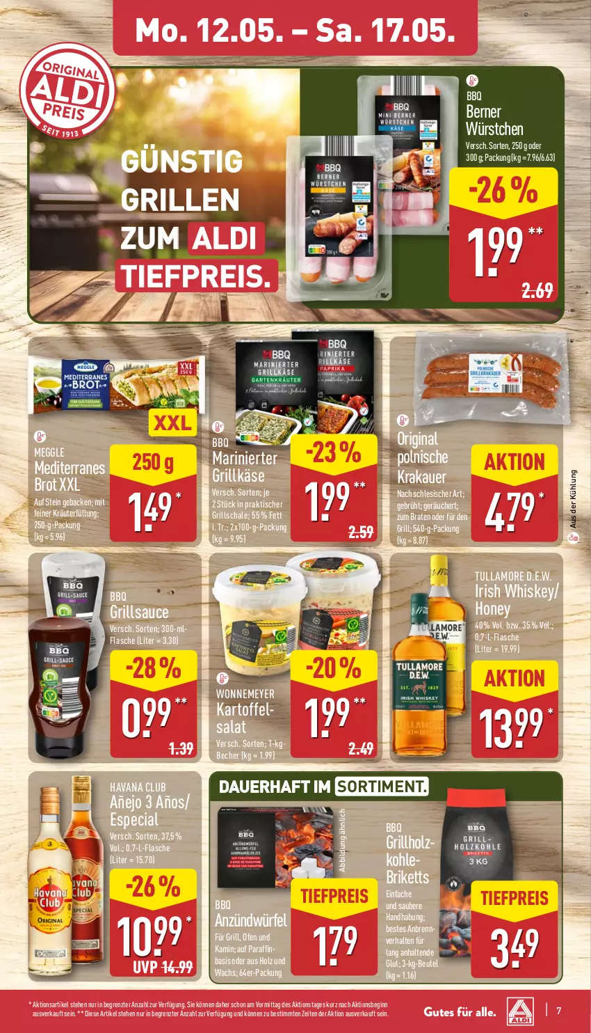 Mo. 12.05. – Sa. 17.05. BBQ Berner Würstchen GÜNSTIG GRILLEN ZUM ZU M ALD ALDII TIEFPREIS. MEGGLE Mediterranes Brot XXL Auf Stein gebacken; mit feiner Kräuterfüllung; 250-g-Packung (kg = 5.96) 250 g 1.49 BBQ Marinierter Grillkäse Versch. Sorten; je 2 Stück in praktischer Grillschale; 55 % Fett i. Tr.; 2x100-g-Packung (kg = 9.95) * -26 % 1.99 ** 2.69 Original polnische Krakauer -23 % 1.99 ** Nach schlesischer Art; gebrüht; geräuchert; zum Braten oder für den Grill; 540-g-Packung (kg = 8.87) 2.59 AKTION 4.79 Aus der Kühlung XXL Versch. Sorten, 250 g oder 300 g; Packung (kg = 7.96/6.63) * TULLAMORE D.E.W. Irish Whiskey/ Honey BBQ Grillsauce Versch. Sorten; 300-mlFlasche (Liter = 3.30) -28 % ** 1.39 HAVANA CLUB Añejo 3 Años/ Especial -20 % WONNEMEYER Kartoffelsalat Versch. Sorten; 1-kgBecher (kg = 1.99) 10.99 * UVP 14.99 AKTION 13.99 ** 2.49 * DAUERHAFT IM SORTIMENT. Versch. Sorten, 37,5 % Vol.; 0,7-L-Flasche (Liter = 15.70) -26 % 1.99 Abbildung ähnlich 0.99 40 % Vol. bzw. 35 % Vol.; 0,7-L-Flasche (Liter = 19.99) BBQ Anzündwürfel Für Grill, Ofen und Kamin; auf Paraffin basis oder aus Holz und Wachs; 64er-Packung TIEFPREIS 1.79 BBQ Grillholz kohleBriketts Einfache und saubere Handhabung; bestes Anbrenn verhalten für lang anhaltende Glut; 3-kg-Beutel (kg = 1.16) * Aktionsartikel stehen nur in begrenzter Anzahl zur Verfügung. Sie können daher schon am Vormittag des Aktionstages kurz nach Aktionsbeginn ausverkauft sein. ** Diese Artikel stehen nur in begrenzter Anzahl zur Verfügung und können zu bestimmten Zeiten der Aktion ausverkauft sein. TIEFPREIS 3.49 Gutes für alle. 7