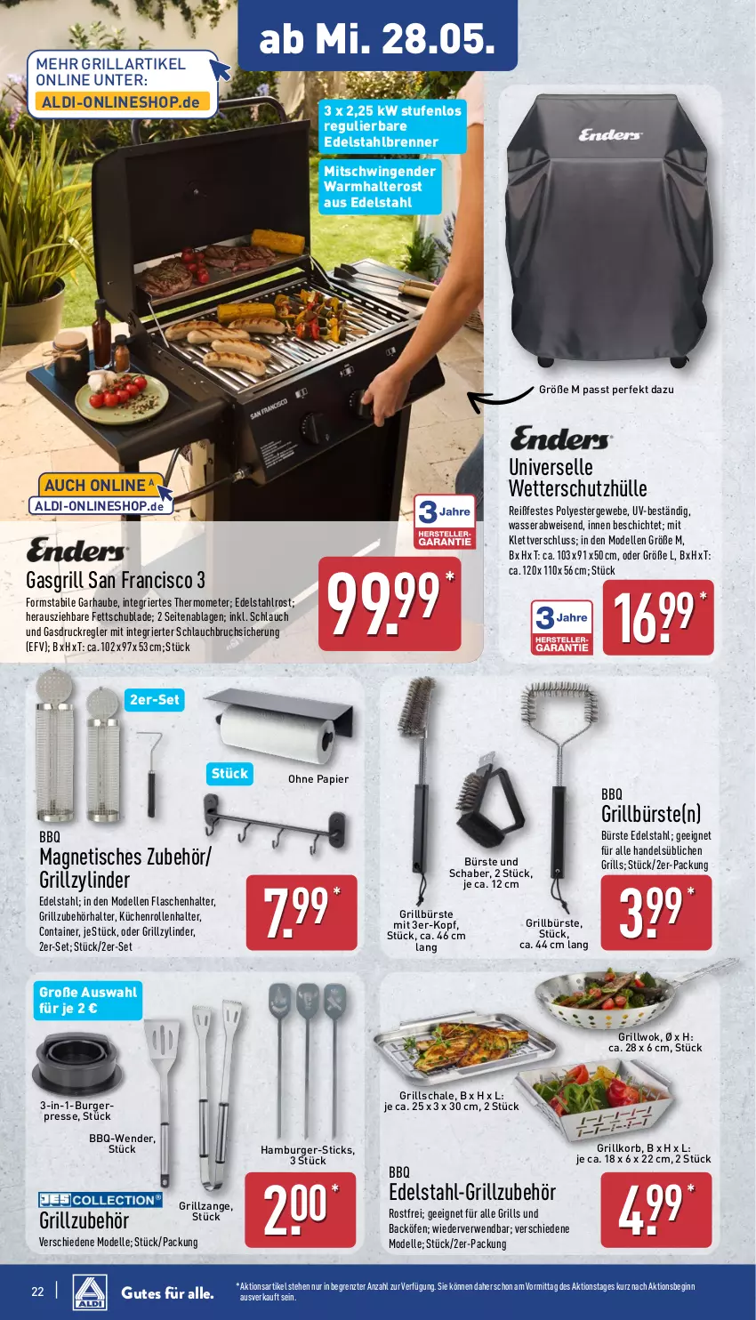 ab Mi. 28.05. MEHR GRILLARTIKEL ONLINE UNTER: ALDI-ONLINESHOP.de 3 x 2,25 kW stufenlos regulierbare Edelstahlbrenner Mitschwingender Warmhalterost aus Edelstahl Größe M passt perfekt dazu Universelle Wetterschutzhülle AUCH ONLINE A ALDI-ONLINESHOP.de Gasgrill San Francisco 3 Formstabile Garhaube, integriertes Thermometer; Edelstahlrost; herausziehbare Fettschublade; 2 Seitenablagen; inkl. Schlauch und Gasdruckregler mit integrierter Schlauchbruchsicherung (EFV); B x H x T: ca. 102 x 97 x 53 cm; Stück 99.99 * Reißfestes Polyestergewebe, UV-beständig, wasserabweisend, innen beschichtet; mit Klettverschluss; in den Modellen Größe M, B x H x T: ca. 103 x 91 x 50 cm, oder Größe L, B x H x T: ca. 120 x 110 x 56 cm; Stück 16.99 * 2er-Set Stück Ohne Papier BBQ Grillbürste(n) BBQ Magnetisches Zubehör/ Grillzylinder Edelstahl; in den Modellen Flaschenhalter, Grillzubehörhalter, Küchenrollenhalter, Container, je Stück, oder Grillzylinder, 2er-Set; Stück/2er-Set 7.99 * Bürste Edelstahl; geeignet für alle handelsüblichen Grills; Stück/2er-Packung Bürste und Schaber, 2 Stück, je ca. 12 cm Grillbürste mit 3er-Kopf, Stück, ca. 46 cm lang Grillbürste, Stück, ca. 44 cm lang 3.99 * Große Auswahl für je 2 € Grillwok, Ø x H: ca. 28 x 6 cm, Stück Grillschale, B x H x L: je ca. 25 x 3 x 30 cm, 2 Stück 3-in-1-Burgerpresse, Stück BBQ-Wender, Stück Grillzubehör Hamburger-Sticks, 3 Stück Grillzange, Stück Verschiedene Modelle; Stück/Packung 22 Gutes für alle. 2.00 * BBQ Edelstahl-Grillzubehör Rostfrei; geeignet für alle Grills und Backöfen; wiederverwendbar; verschiedene Modelle; Stück/2er-Packung Grillkorb, B x H x L: je ca. 18 x 6 x 22 cm, 2 Stück 4.99 * * Aktionsartikel stehen nur in begrenzter Anzahl zur Verfügung. Sie können daher schon am Vormittag des Aktionstages kurz nach Aktionsbeginn ausverkauft sein.