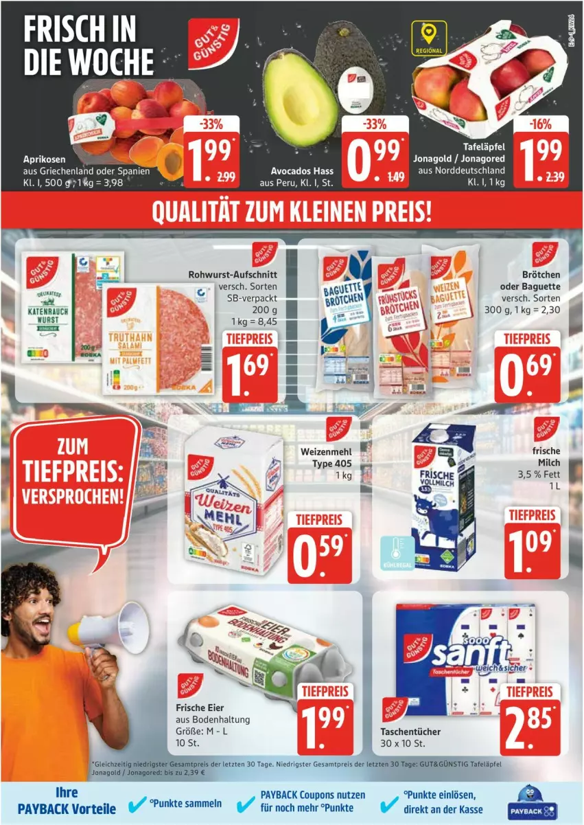 FRISCH IN DIE WOCHE Aprikosen aus Griechenland FE Spanien LOB ET N: Ha TEE 32:] Avocados Hass aus Peru, Kl. |, St. Rohwurst-Aufschnitt : Pr versch. Sorten SB-verpackt RR 3 | Pe | KÄTENRAUCH 200 9 WURST | 1kg=8,45 Weizenmehl ® Type 405 y Ikg 5 X Frische Eier aus Bodenhaltung Größe: M-L 10 St. fer letzten 30 Tage. Niedrigster Gesamtpreis der Ihre PAYBACK Coupons nutzen PAYBACK Vorteile v “Punkte sammeln für noch mehr °Punkte Punkte einlösen, direkt an der Kasse Tafeläpfel Jonagold / Jonagored aus Norddeutschland N?) Brötchen oder Baguette \ versch. Sorten 2. | 3009, 1kg = 2,30 5 frische Milch 3,5% a 8 A r a Taschentücher 30 x 10 St. os LOST