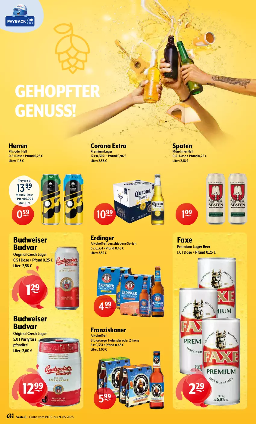 GEHOPFTER GENUSS! Herren Pils oder Hell 0,5 l Dose + Pfand 0,25 € Liter: 1,18 € Corona Extra Premium Lager 12 x 0,355 l + Pfand 0,96 € Liter: 2,58 € Spaten Münchner Hell 0,5 l Dose + Pfand 0,25 € Liter: 2,18 € Traypreis: 13 99 24 x 0,5 l Dose + Pfand 6,00 € Liter: 1,17 € 059 Budweiser Budvar Original Czech Lager 0,5 l Dose + Pfand 0,25 € Liter: 2,58 € 1099 109 Erdinger Faxe Alkoholfrei, verschiedene Sorten 6 x 0,33 l + Pfand 0,48 € Liter: 2,52 € Premium Lager Beer 1,0 l Dose + Pfand 0,25 € 129 499 Budweiser Budvar Original Czech Lager 5,0 l Partyfass pfandfrei Liter: 2,60 € 1299 Seite 6 – Gültig vom 19.05. bis 24.05.2025 Franziskaner Alkoholfrei Blutorange, Holunder oder Zitrone 6 x 0,33 l + Pfand 0,48 € Liter: 3,03 € 599 229