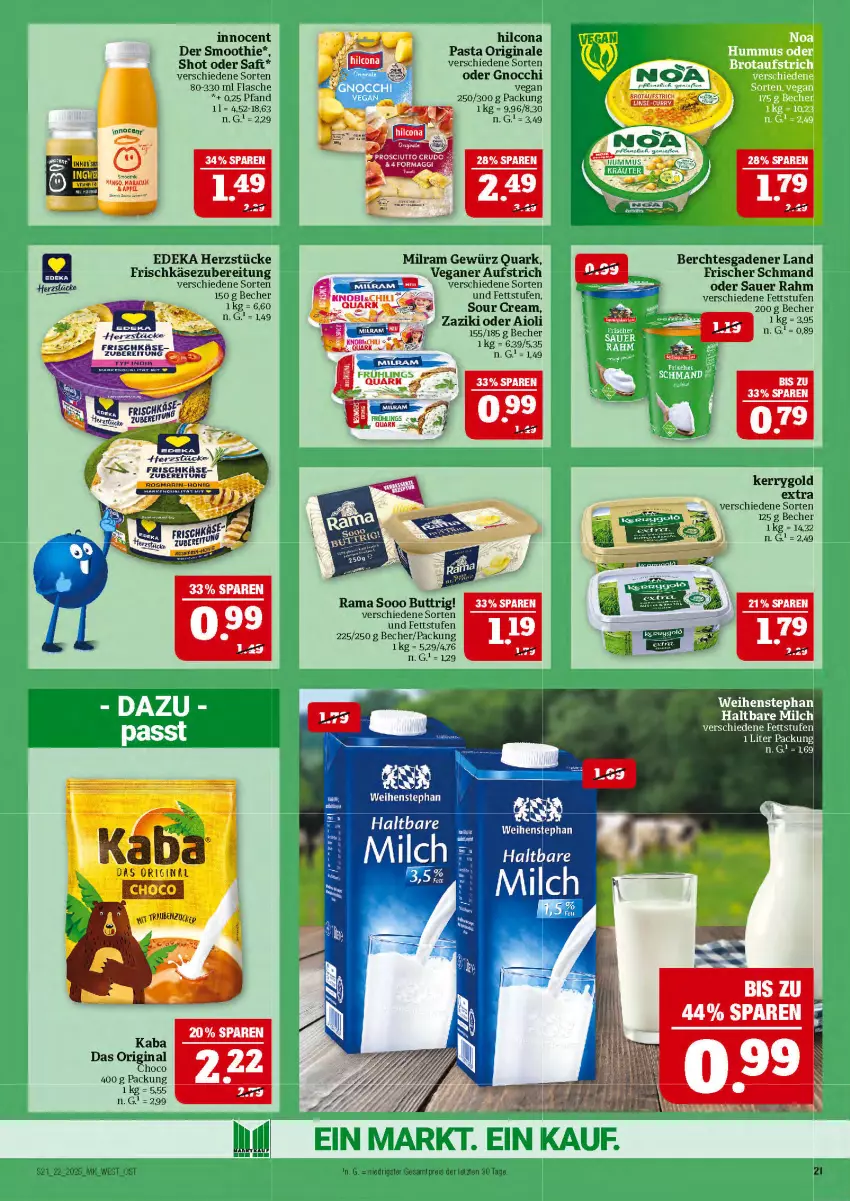innocent hilcona Der Smoothie*, Pasta Originale Shot oder Safı* # verschiedene Sorten verschiedene Sorten oder Gnocchi 80-330 ml Flasche vegan *+ 0,25 Pfand 250/300 g Packung = ÜBROTAUFSTRICH 11= 4,52-18,63 1 kg = 9,96/8.30 | LINnse-CuRRY | ILS = j n.G.1=229 n.G.1=3.49 nnocene ©) Een, Smocenie NANGO, MARACUA S APFEL a nnusa EDEKA Herzstücke Milram Gewürz Quark, = Berchtesgadener Land Frischkäsezubereitung Veganer Aufstrich =) Frischer Schmand 150 g Becher und Fettstufen, verschiedene Fettstufen Herzsläcke verschiedene Sorten = In verschiedene Sorten 0 oder Sauer Rahm - A Sour Cream, 200 g Becher wen Ben / Zaziki oder Aioli 1 kg - 395 j AHfrerzsläcke 155/185 g Becher n. G.!= 0,89 FRISCHKÄSE- EBEr a Er 029| Sn \ BIS ZU 33% SPAREN FRISCHKÄSE- ZUBEREITUNG ROSMARIN-HONIG kerrygold extra verschiedene Sorten 15 g Becher \ 1kg = 14,32 n. G1=2,49 rs) SPAREN Rama Sooo Buttrig! &+Y%37.1,3) verschiedeneSorten eeuguugsej 0: r\TCY) und Fettstufen 19 225/250 g Becher/Packung = 173 Le 1kg = 5.29/4,76 n.G.!=129 Weihenstephan Haltbare Milch verschiedene Fettstufen BO Aid te ahnt: n.G.!=1,69 Weihenstephan Haltbare NEISSE Bulle 3 aLlUtTe 52 Muh: # 0. IP er 2. u DAS ORIGINAL F Fi gr Er = = = BIS ZU End, VG KH; SPAREN Kaba Das Original 222 Choco 400 g Packung 1kg=-5,55 n.G!=299 a In. r af hi ERE Ba 521_22.2025_MK_WEST_OST 'n. &. = niedrigster Gesamtpreis der letzten 30 Tage 21
