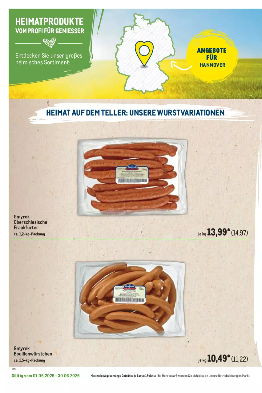 HEIMATPRODUKTE VOM PROFI FÜR GENIESSER Entdecken Sie unser großes heimisches Sortiment: ANGEBOTE FÜR HANNOVER HEIMAT AUF DEM TELLER: UNSERE WURSTVARIATIONEN Gmyrek Oberschlesische Frankfurter ca. 1,2-kg-Packung je kg 13,99* (14,97) je kg 10,49 (11,22) 10,49* Gmyrek Bouillonwürstchen ca. 1,5-kg-Packung 639 Gültig vom 01.06.2025 - 30.06.2025 Maximale Abgabemenge Getränke je Sorte: 1 Palette Bei Mehrbedarf wenden Sie sich bitte an unsere Betriebsleitung im Markt