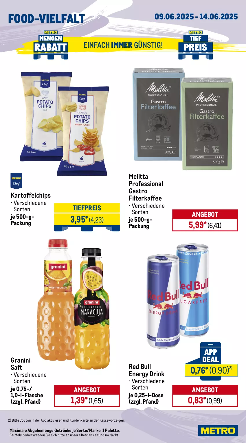 FOOD-VIELFALT 09.06.2025 - 14.06.2025 FOOD-VIELFALT EINFACH IMMER GÜNSTIG! Heinz Tomato Ketchup oder Mayonnaise • Verschiedene Sorten je 500-mlFlasche Mondamin Fix-Saucenbinder • Hell oder Dunkel je 1-kg-Dose EINFACH IMMER GÜNSTIG! Mississippi Barbecue-Saucen ANGEBOT 1,85* (1,98) • Verschiedene Sorten je 1814-gFlasche Kartoffelchips TIEFPREIS 5,99* (6,41) • Verschiedene Sorten je 500-gPackung TIEFPREIS 3,95* (4,23) Granini Saft TIEFPREIS 7,99* (8,55) Oro Di Parma Pizzasauce 2650-ml-Dose 09.06.2025 - 14.06.2025 ANGEBOT 8,49* (9,08) • Verschiedene Sorten je 0,75-/ 1,0-l-Flasche (zzgl. Pfand) Melitta Professional Gastro Filterkaffee • Verschiedene Sorten je 500-gPackung Red Bull Energy Drink ANGEBOT 1,39* (1,65) 2) Bitte Coupon in der App aktivieren und Kundenkarte an der Kasse vorzeigen. Maximale Abgabemenge Getränke je Sorte/Marke: 1 Palette. Bei Mehrbedarf wenden Sie sich bitte an unsere Betriebsleitung im Markt. • Verschiedene Sorten je 0,25-l-Dose (zzgl. Pfand) ANGEBOT 5,99* (6,41) APP DEAL 0,76*(0,90)2) ANGEBOT 0,83* (0,99)