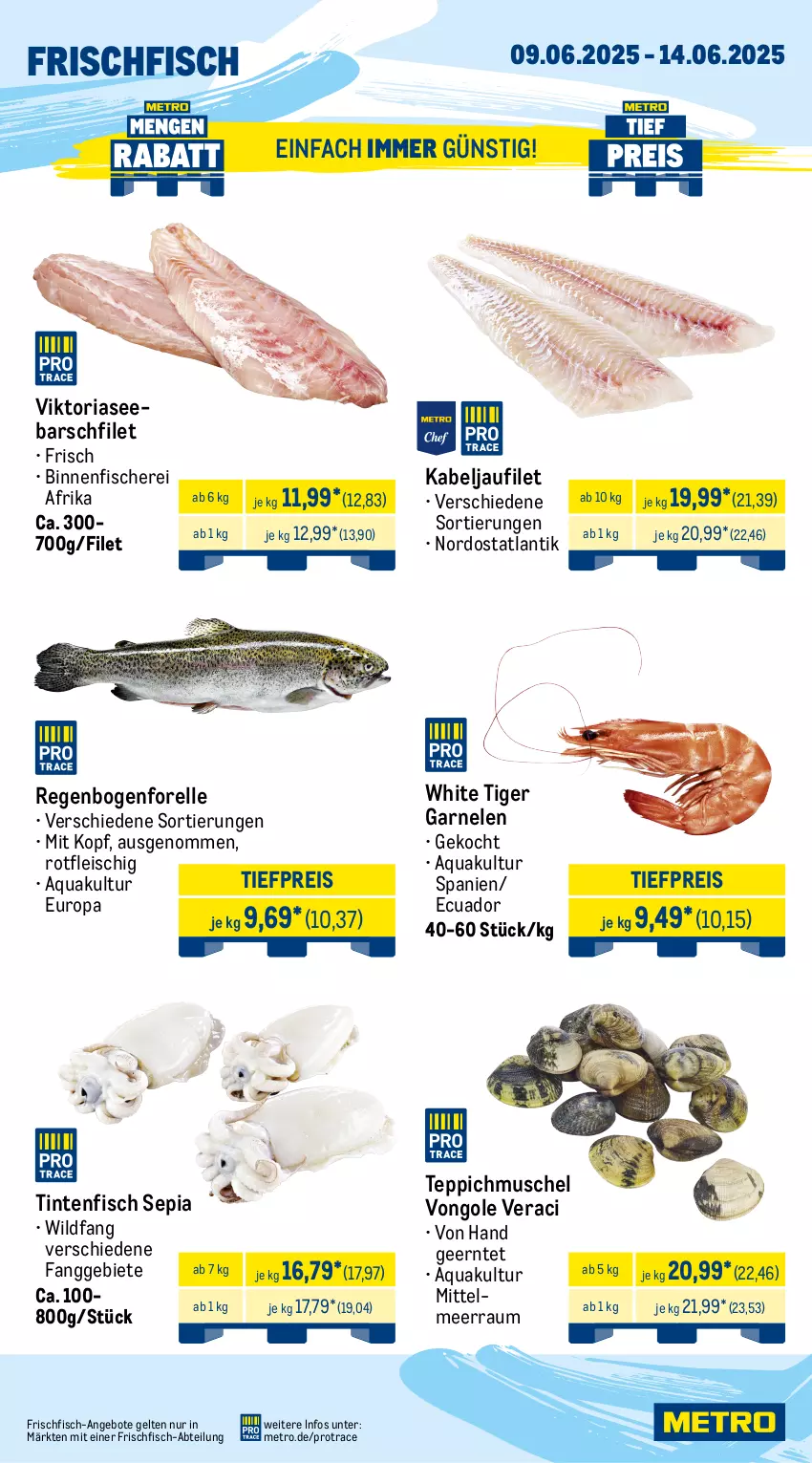FLEISCH 09.06.2025 - 14.06.2025 FRISCHFISCH EINFACH IMMER GÜNSTIG! 09.06.2025 - 14.06.2025 EINFACH IMMER GÜNSTIG! Viktoriaseebarschfilet Porki Dry aged Schweinerücken-/Ribeye-Steaks • Ca. 21 Tage am Knochen gereift • Vom deutschen Landschwein • 4 x ca. 200 g, vak.-verp. ANGEBOT ca. 800-gje kg 14,49* (15,50) Packung • Frisch • Binnenfischerei Afrika Ca. 300700g/Filet ab 6 kg ab 1 kg je kg 11,99* (12,83) je kg 12,99* (13,90) ab 10 kg je kg 19,99* (21,39) je kg 20,99* (22,46) ab 1 kg • Ca. 21 Tage gereift • Vom deutschen Rind • Vak.-verp. ANGEBOT ca. 1,2-kgje kg 29,99* (32,09) Stücke • Verschiedene Sortierungen • Mit Kopf, ausgenommen, rotfleischig TIEFPREIS • Aquakultur Europa je kg • Saftige Rinderrippen am Knochen gereift • Natur/gewürzt • Vak.-verp. ANGEBOT ca. 1-kgje kg 17,99* (19,25) Packung • Verschiedene Sortierungen • Nordostatlantik Emsrind Dry aged Tomahawk Steak Regenbogenforelle Emsrind Dry aged Rinder Short Ribs Kabeljaufilet Emsrind Dry aged Rinder Flanksteak natur/ in Whiskey-Marinade • Ca. 21 Tage gereift • Vom deutschen Rind • Vak.-verp. ANGEBOT ca. 1,5-kgje kg 19,99* (21,39) Packung 9,69* (10,37) • Gekocht • Aquakultur Spanien/ Ecuador 40-60 Stück/kg TIEFPREIS je kg 9,49* (10,15) Teppichmuschel Vongole Veraci Tintenfisch Sepia • Wildfang verschiedene Fanggebiete Ca. 100800g/Stück White Tiger Garnelen ab 7 kg ab 1 kg Frischfisch-Angebote gelten nur in Märkten mit einer Frischfisch-Abteilung je kg 16,79* (17,97) je kg 17,79* (19,04) weitere Infos unter: metro.de/protrace • Von Hand geerntet • Aquakultur Mittelmeerraum ab 5 kg ab 1 kg je kg 20,99* (22,46) je kg 21,99* (23,53)