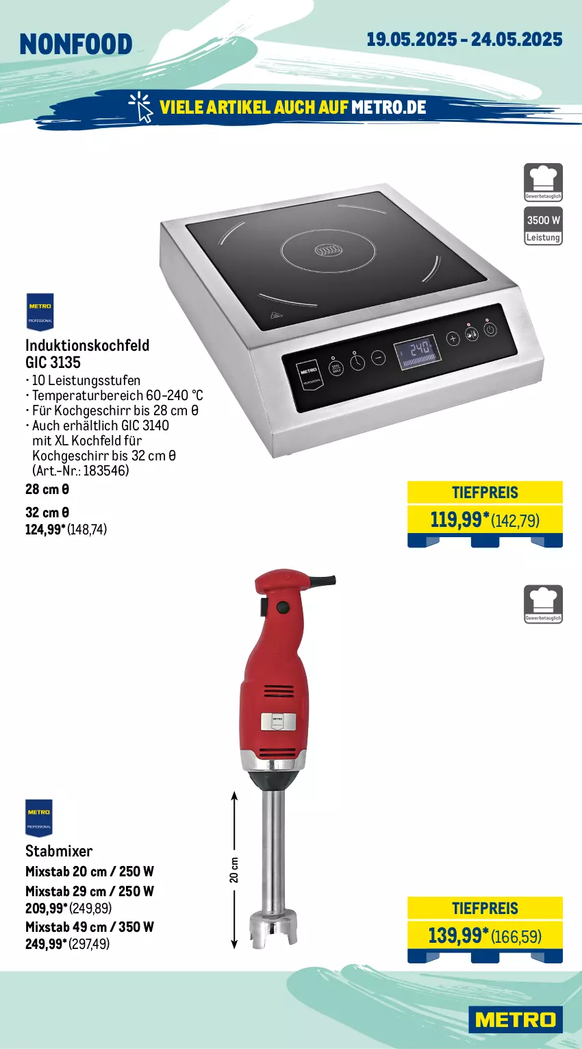NONFOOD 19.05.2025 - 24.05.2025 NONFOOD VIELE ARTIKEL AUCH AUF METRO.DE 19.05.2025 - 24.05.2025 VIELE ARTIKEL AUCH AUF METRO.DE 3500 W Leistung Induktionskochfeld GIC 3135 Akkusauger Duoflex HX1 6) Profi-Bodenstaubsauger Henry Compact HVR160 • HochleistungsIndustriemotor • HochleistungsFiltersystem mit Dauerfilter • Filtervolumen: 6 l • Edelstahlsaugrohr mit Saugstärkeregelung & Geräuschdämpfer, 10 Meter Kabel und 2,2 m Schlauch ** Ihr möglicher Wiederverkaufspreis = unverbindliche Preisempfehlung des Herstellers 6) Nicht in Metro Gastro-Märkten erhältlich. UVP** € 339,00 ANGEBOT nur 199,99* (237,99) TIEFPREIS 32 cm Ø 124,99* (148,74) 119,99* (142,79) 2 x 3 Stk. Filterbeutel NVM-1CH HEPA-FLO Stabmixer UVP** € 225,00 ANGEBOT nur 109,99* (130,89) Mixstab 20 cm / 250 W Mixstab 29 cm / 250 W 209,99* (249,89) Mixstab 49 cm / 350 W 249,99* (297,49) 20 cm • Max. Laufzeit: 55 min, zweistufiges Filtersystem • Speedlock (schneller Wechsel zwischen Komplettund Handgerät) • 10 Leistungsstufen • Temperaturbereich 60-240 °C • Für Kochgeschirr bis 28 cm Ø • Auch erhältlich GIC 3140 mit XL Kochfeld für Kochgeschirr bis 32 cm Ø (Art.-Nr.: 183546) 28 cm Ø TIEFPREIS 139,99* (166,59)