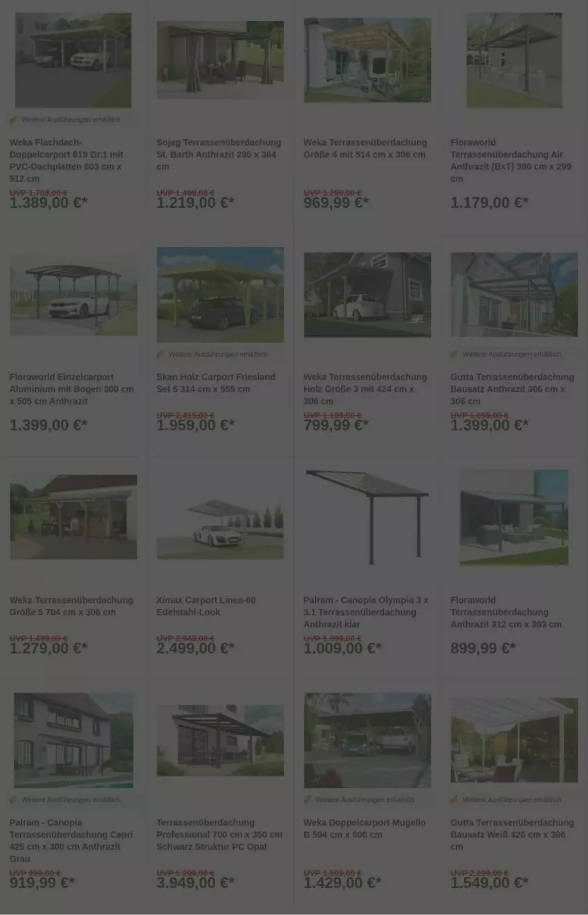 2 Weltere Ausführungen erhältlich Weka Flachdach- Doppelcarport 618 Gr.1 mit PVC-Dachplatten 603 cm x 512 cm 1.389,00 €* Sojag Terrassenüberdachung St. Barth Anthrazit 296 x 364 1.219,00 €* Weka Terrassenüberdachung Floraworld Größe 4 mit 514 cm x 306 cm Terrassenüberdachung Air Anthrazit [BXT) 390 cm x 299 cm €* 1.179,00 €* z Weitere Ausführungen erhältlich Skan Holz Carport Friesland Sset5314cmx 555 cm Floraworld Einzelcarport Aluminium mit Bogen 300 cm x 505 cm Anthrazit 1.399,00 €* 1.959,00 €* z’ Weitere Ausführungen erhäliilch Weka Terrassenüberdachung Gutta Terrassenüberdachung Holz Größe 3 mit 424 cm x Bausatz Anthrazit 306 cm x 306 cm 306 cm 00 €* Ximax Carport Linea-60 Edelstahl-Look Weka Terrassenüberdachung Größe 5 704 cm x 306 cm 1.279,00 €* re IT] ink N g' Weitere Ausführungen erhältlich Palram - Canopia Terrassenüberdachung Capri 425 cm x 300 cm Anthrazit Terrassenüberdachung Professional 700 cm x 350 cm Schwarz Struktur PC Opal 919.99 €* 3.949.00 €* Palram - Canopia Olympia 3x Floraworld 3.1 Terrassenüberdachung Terrassenliberdachung Anthrazit klar Anthrazit 312 cm x 303 cm 899,99 €* 2’ Weitere Ausführungen erhäftlich # Weitere Ausführungen erhältlich Weka Doppelcarport Mugello Gutta Terrassenüberdachung B 594 cm x 606 cm Bausatz Weiß 426 cm x 306 cm 1.429.00 €* &