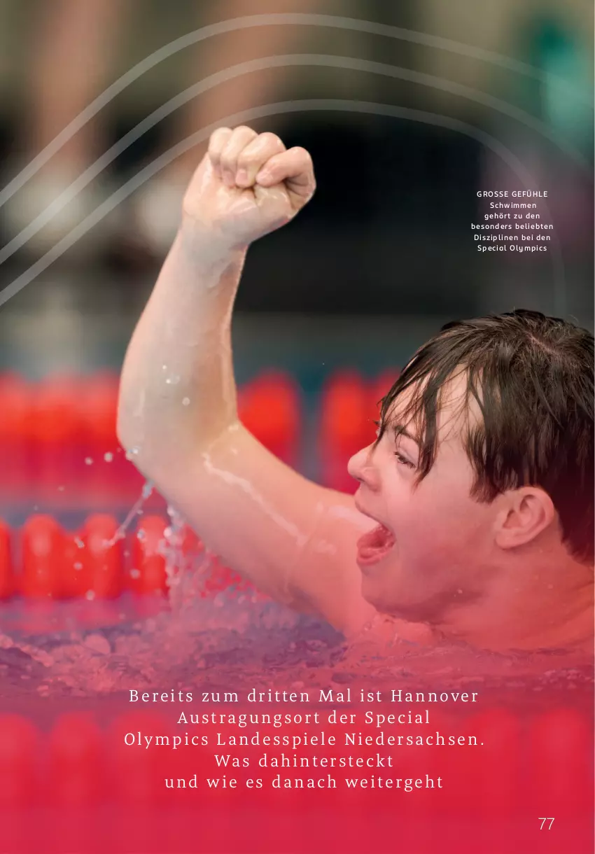 GROSSE GEFÜHLE Schwimmen gehört zu den besonders beliebten Disziplinen bei den Special Olympics B e r e i t s z u m d r i t t e n M a l i s t H a n n o ve r Austragungsort der Special Olympics Landesspiele Niedersachsen. Wa s d a h i n t e r s t e c k t u n d w i e e s d a n a c h we i t e rg e h t 77