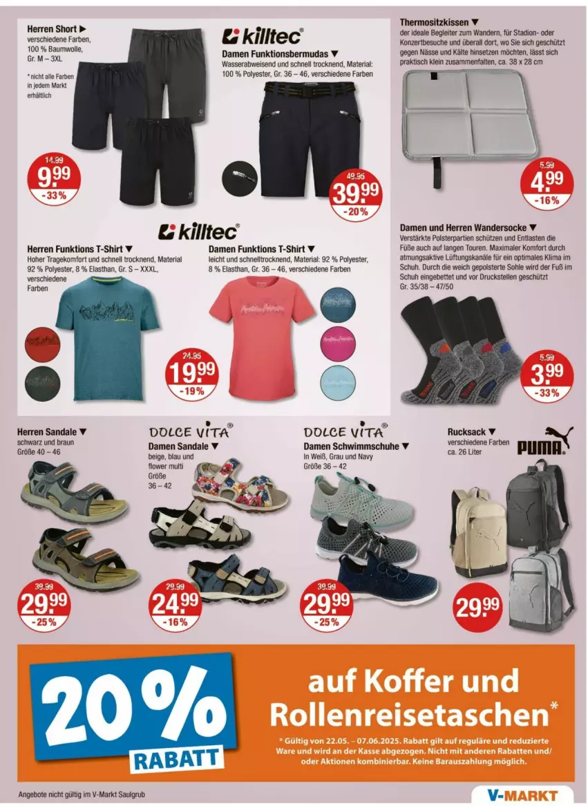 Herren Short > verschiedene Farben, 100 % Baumwolle, Gr. M-3XL Ekilltec' Damen Funktionsbermudas W Wasserabweisend und schnell trocknend, Material: "nicht alle Farben. 100 % Polyester, Gr. 36 — 46, verschiedene Farben in jedem Markt erhältlich N Ekilltec Damen Funktions T-Shirt W leicht und schnelltrocknend, Material: 92 % Polyester, 8 % Elasthan, Gr. 36 - 46, verschiedene Farben Herren Funktions T-Shirt W Hoher Tragekomfort und schnell trocknend, Material 92 % Polyester, 8 % Elasthan, Gr. S- XXXL, verschiedene Farben © Thermositzkissen W der ideale Begleiter zum Wandern, für Stadion- oder Konzertbesuche und überall dort, wo Sie sich geschützt gegen Nässe und Kälte hinsetzen möchten, lässt sich praktisch klein zusammenfalten, ca. 38 x 28 cm Damen und Herren Wandersocke W Verstärkte Polsterpartien schützen und Entlasten die Füße auch auf langen Touren. Maximaler Komfort durch atmungsaktive Lüftungskanäle für ein optimales Klima im Schuh. Durch die weich gepolsterte Sohle wird der Fuß im Schuh eingebettet und vor Druckstellen geschützt Gr. 35/38 - 47/50 . . . ® Herren Sandale W DOLCE VITA DOLCE VITA Rucksack W nf schwarz und braun a verschiedene Farben Damen Sandale W Damen Schwimmschuhe 7 GrObe 046 beige, blau und In Weiß, Grau und Navy ca. 26 Liter PUMN. flower multi Größe 36 - 42 Größe 36-42 ‚Angebote nicht gültig im V-Markt Saulgrub V-